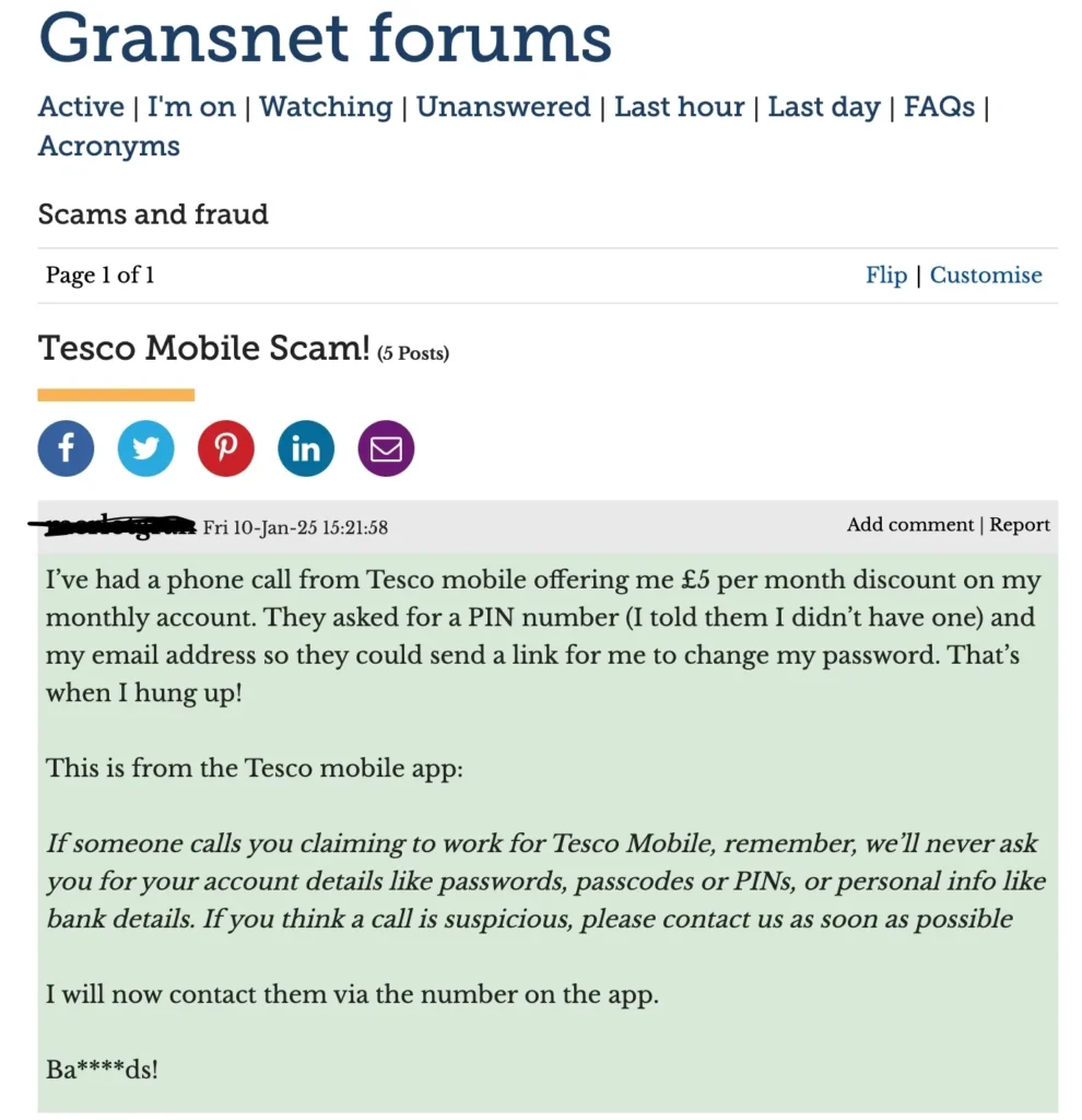 Here’s a snapshot from a public Gransnet forum, where an older user reports being targeted by a phone scam impersonating Tesco Mobile. The scammer tried to obtain a PIN and email address under the guise of offering a small discount. The user wisely hung up but the post highlights just how everyday, convincing, and invasive these attacks can feel.